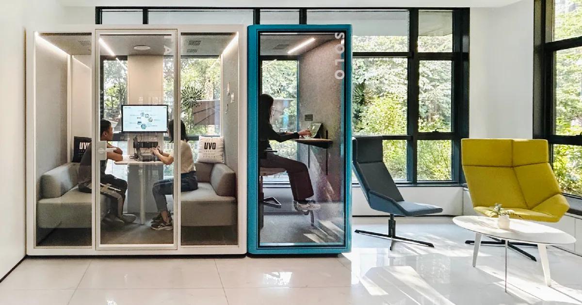 UVO colorful soundproof booths elevate office design—white phone pods, Summer Blue/black Solo A, navy Solo H, Talk & Pastel Yellow/Avocado Green Talk Plus for solo to 4+ person workspaces.
